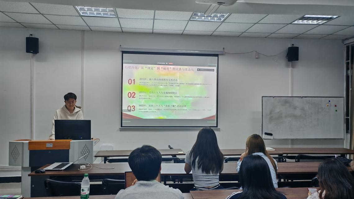 支部党员首先共同研习中央八项规定精神的发展历程。随后,党员们通过案例的学习深刻领会到了中央八项规定精神“问题导向、以上率下、长效机制”的特点和遏制“四风”、重塑党群联系的重要价值。结合法学专业特点,还明确了在思想层面要厚植“为人民服务”的宗旨意识,学术方面要抵制“重数量轻质量”的形式主义作风,职业方面要契合“公正廉洁”的法律伦理要求。