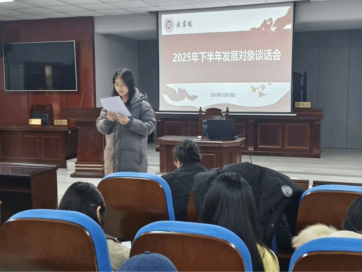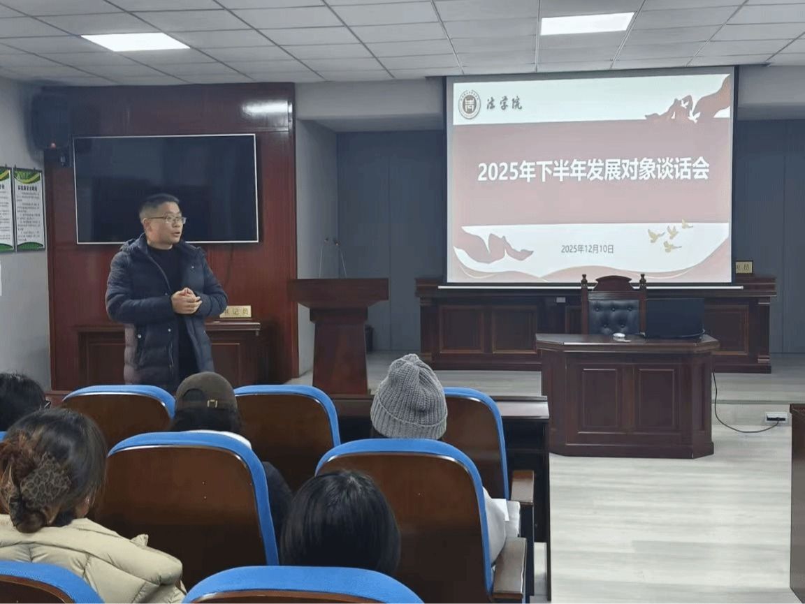 12月10日下午,法学院在文法楼 119 会议室召开 2025 年下半年党员发展对象谈话会。学院党委书记周海波,党委办公室主任匡薇、副主任向建桦,党委办公室老师徐菁及2025年下半年发展对象参与会议,会议由匡薇主持。