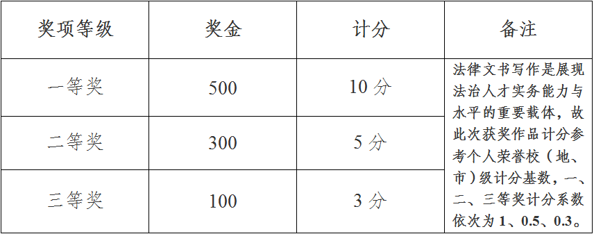 (一)学院评选优秀作品颁发奖金和荣誉证书。获奖同学参考《法学院研究生奖学金评审计分标准(试行)》中“五、个人荣誉”计分基数赋分,可用于奖学金评定。