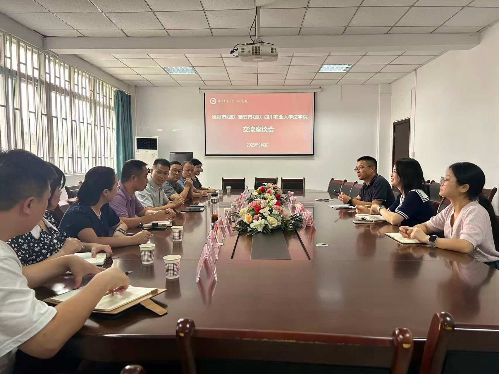 9月3日,德阳市残联党组书记、理事长李长英和雅安市党组书记、理事长陈永康一行9人就法学专业2025级新生罗岑宸入学事宜来访我院。院党委书记周海波,党委副书记、纪委书记、副院长唐薇,党委办公室主任匡薇和学生处学生科巫群瑶接待了来访客人。