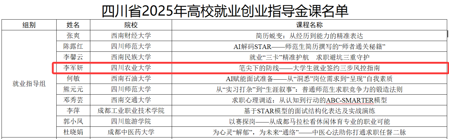 近日,由四川省教育厅、四川省人力资源和社会保障厅主办的2025年高校就业创业指导金课建设活动省级评选圆满落幕。我院教师李军妍的就业指导课程《笔尖下的防线——大学生就业签约三步风控指南》历经考验成功突围,入选四川省2025年高校就业创业指导金课。