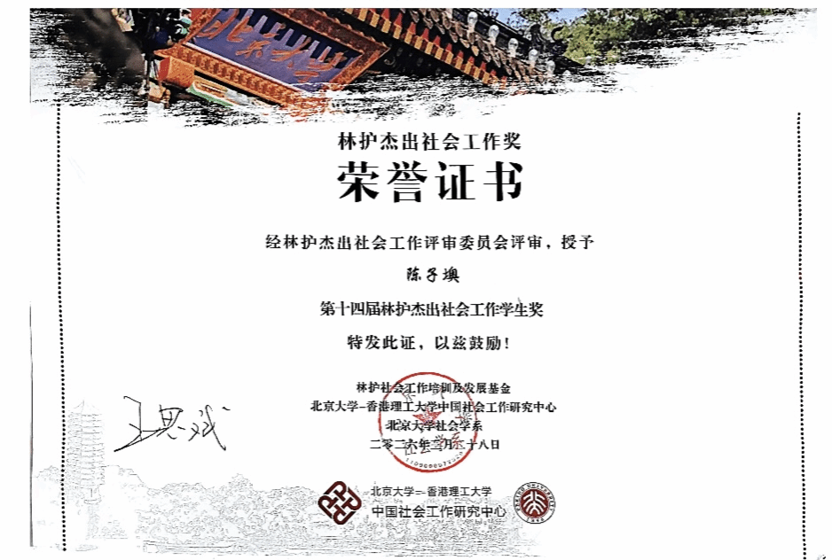 近日,第十四届林护杰出社会工作奖颁奖典礼暨北京大学-芝加哥大学-香港理工大学三校论坛在北京大学镜春园83号成功举办。法学院社会工作系2022级本科生陈子墺凭借扎实的专业功底、丰富的社会实践、突出的科研成果与深厚的社工情怀,从全国众多参评者中脱颖而出,成功斩获这一国内社会工作专业学生领域的最高荣誉,获得第十四届林护杰出社会工作学生奖。